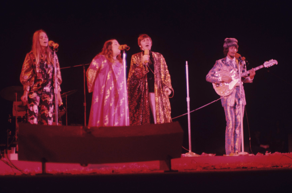 WHILE WATCHING THE MOVIE I recurrently found myself either seeing artists in different lights or appreciating ones I already loved in ways I hadn’t before. I’ve never much liked the Mamas & the Papas, the folk-pop band whose whole thing was that they had two girl singers and two guy singers who belted, with almost childlike reverie, to childlike and reverential instrumentals. The foursome had its moments: I love “Straight Shooter,” “Snowqueen of Texas.” But there’s a certain insufferable tweeness to their music that cannot be enjoyed for too long of a time period, though I do like Cass Elliot, the amply voiced personality who in my mind is the leader of the group even though that role clearly belongs to John Phillips. I’ve been long tired of “California Dreamin’,” the act’s most popular and intermittently grating song. (There seem to be recurring periods where it’s used, usually in remix form, in TV commercials.) But through Monterey Pop did I feel like I was getting acquainted with something I was missing out on. The self-serious song, which has a cultish air, becomes octaves more enjoyable with the visual element provided by Pennebaker and co. Frontwomen Elliot and Michelle Phillips are clearly enjoying themselves, almost having to stifle their giggles; there’s an entertaining arguably in-on-the-joke melodrama to the ways frontmen Denny Doherty and John Phillips intone.