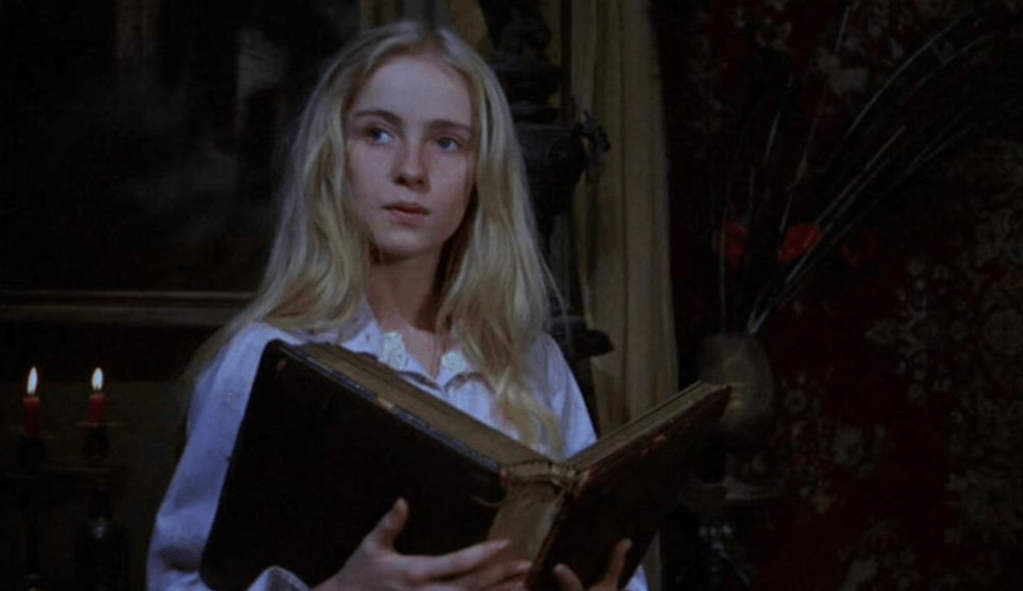 TO BORROW A POPULAR MEME construction, Lemora (1973) is Little Red Riding Hood, but make it vampire. The movie, set in the 1920s, follows a 13-year-old choir girl named Lila (Cheryl Smith). With her long blonde hair, affinity for billowing white dresses, and forever-serene face, the girl suggests an angel. That she is the lead in a horror movie promises that that youthful innocence will be imperiled. Years earlier, we learn that Lila’s gangster father (William Whitton) shot her adulterous mother to death and skipped town. Ever since, Lila has been living with the local priest (Richard Blackburn, who also directed and wrote the movie) whose affections for his adoptive daughter skew creepy.