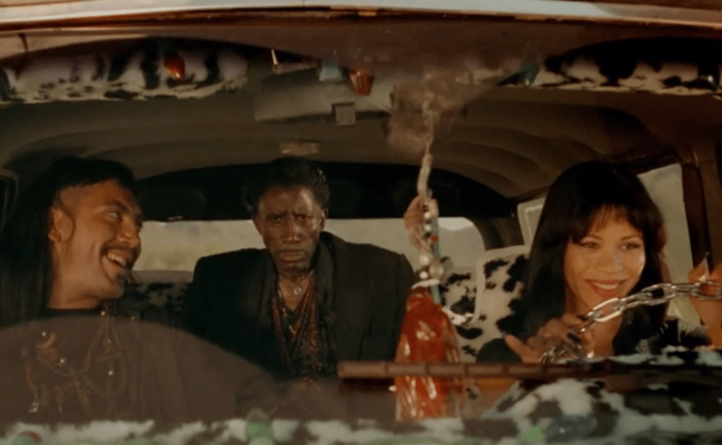 Speeding down the highway inside a beat-up and eccentrically decorated truck — windshield framed with rainbow Christmas lights, seats sleeved in greasy cow print, steering wheel substituted for a circular chain — Rosie Perez and Javier Bardem look just about perfect together. In Dance with the Devil (1997), a splashy and eventful lovers-on-the-run comedy-thriller, they play Perdita and Romeo, a newly together couple from hell who in the course of the film will involve themselves in bank robberies, murder, fraudulent Santería rituals, shootouts, and smugglings, mostly for a laugh. “They’re the devil!” one stunned almost-victim warns onlookers after he’s freed from their clutches. “I saw it in their eyes.”