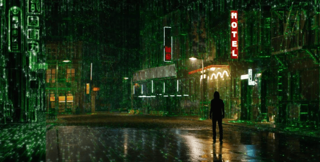 When we enter the world of Resurrections, it’s not quite like the one we’d seen in the earlier movies. Though the main San Francisco setting does look a little too pristine, this universe is seemingly closer to our own lives: everyday people living in it can sit around tables waxing rhapsodic about their love for The Matrix and debating which interpretive framework they think best fits it. (Cryptofascism, trans politics — take your pick.)