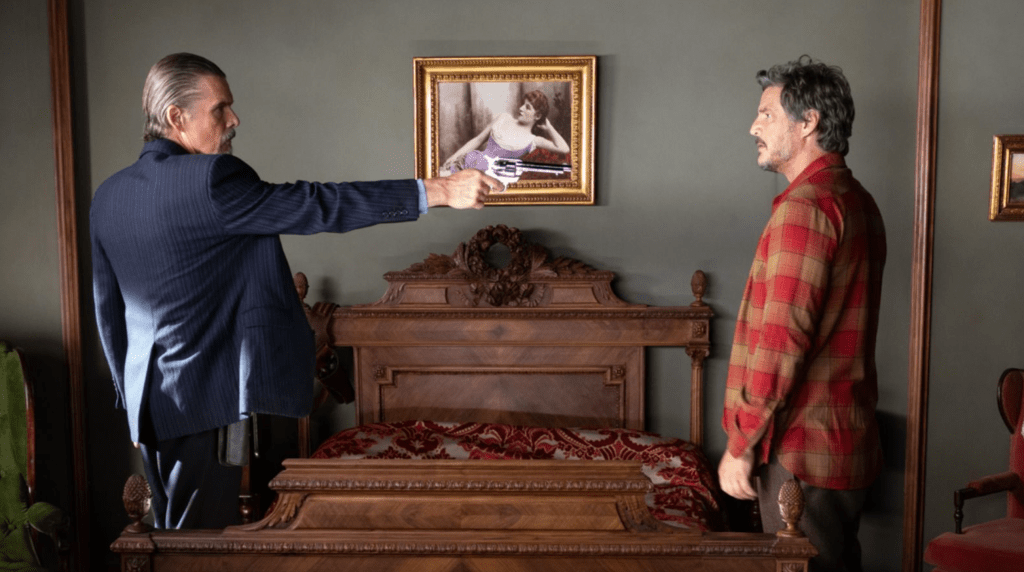 That central drama: the 25-years-coming reunion of Jake and Silva (Ethan Hawke and Pedro Pascal). These cowboys first met as gunslingers, then spent two blissful, hush-hush months together as lovers. Although they can barely suppress the overwhelming joy they feel when seeing each other for the first time after so long, the circumstances bringing their estrangement to an end are not happy. Jake, now a sheriff, is looking for the murderer of his late brother’s wife. Naturally for a work opposed to not taking advantage of any dramatic possibility it can, Jake once had an affair with her. Silva’s volatile adult son (George Steane) is also the prime suspect.