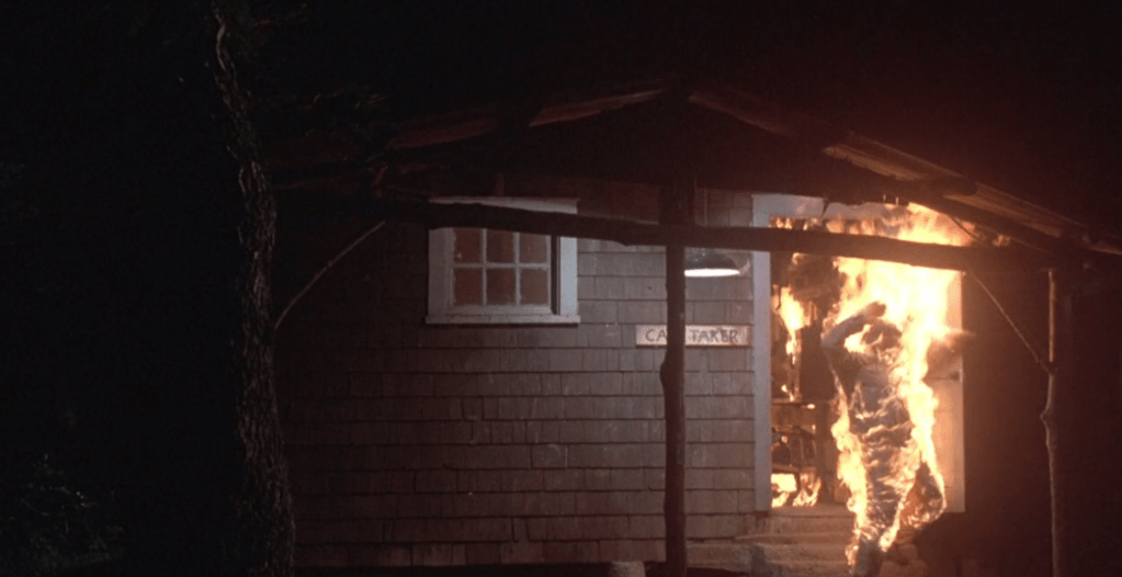 But the plan goes so awry that Cropsy has to be hospitalized, his skin, unable to be salvaged by grafts, so burned that an uncouth doctor at the hospital likens him to an overdone Big Mac, “a monster.” After a five-year stay, a period during which he’s recurrently reminded not to retaliate against the people responsible for his current state, he’s free to go. His anger is so throbbing-hot that one of the first things he does is go into town and murder a sex worker with a pair of scissors she keeps on her vanity, and, I presume because someone mentions it later, torches Camp Blackfoot off-camera.