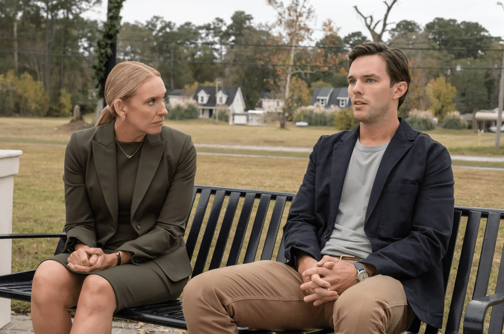 Guilt and trepidation practically beam off an excellent, often conspicuously clammy Hoult, whose work feels like the acting equivalent of a quivering, popping-out forehead vein. Affecting a lilting Southern accent, Toni Collette is wonderful, too, as a politically ambitious, sure-of-herself prosecutor with a blade-like ponytail whose doubts mount the more she hears whispers that the conclusions she’s arrived at are more the result of a hasty, tunnel-visioned investigation than anything founded in reality. “Cheers to the justice system,” the suspect’s lawyer (Chris Messina) will unenthusiastically say to Collette’s character mid-movie while they unwind at a bar, his glass poised for a clink before getting to the discomfiting kicker: “It’s the best we’ve got.”
