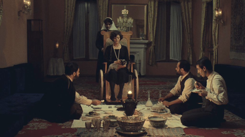 Merely looking at Chess of the Wind makes you grateful for the painstaking revamp. Sumptuously shot by Houshang Baharlou, the movie’s style is paramount rather than secondary, with Aslani noting Georges de La Tour’s influence on the film’s predominating chiaroscuro-heavy compositions. (Much of the movie’s action — overwashed with a slight, claustrophobia-reinforcing orange tint — takes place in the balmy nighttime inside the capacious mansion the cast rarely leaves.)